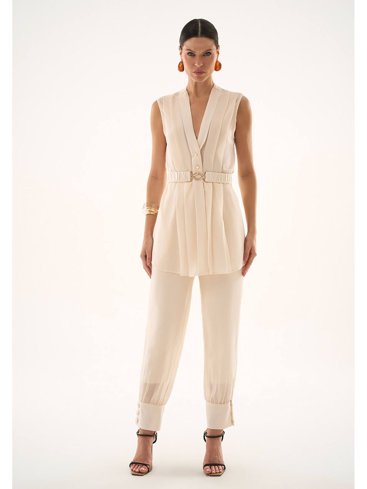 Calça com cós de elástico que valoriza a cintura e proporciona excelente caimento. Os detalhes de botões na parte inferior da perna adicionam charme e personalidade à peça, ideal para produções modernas e elegantes.