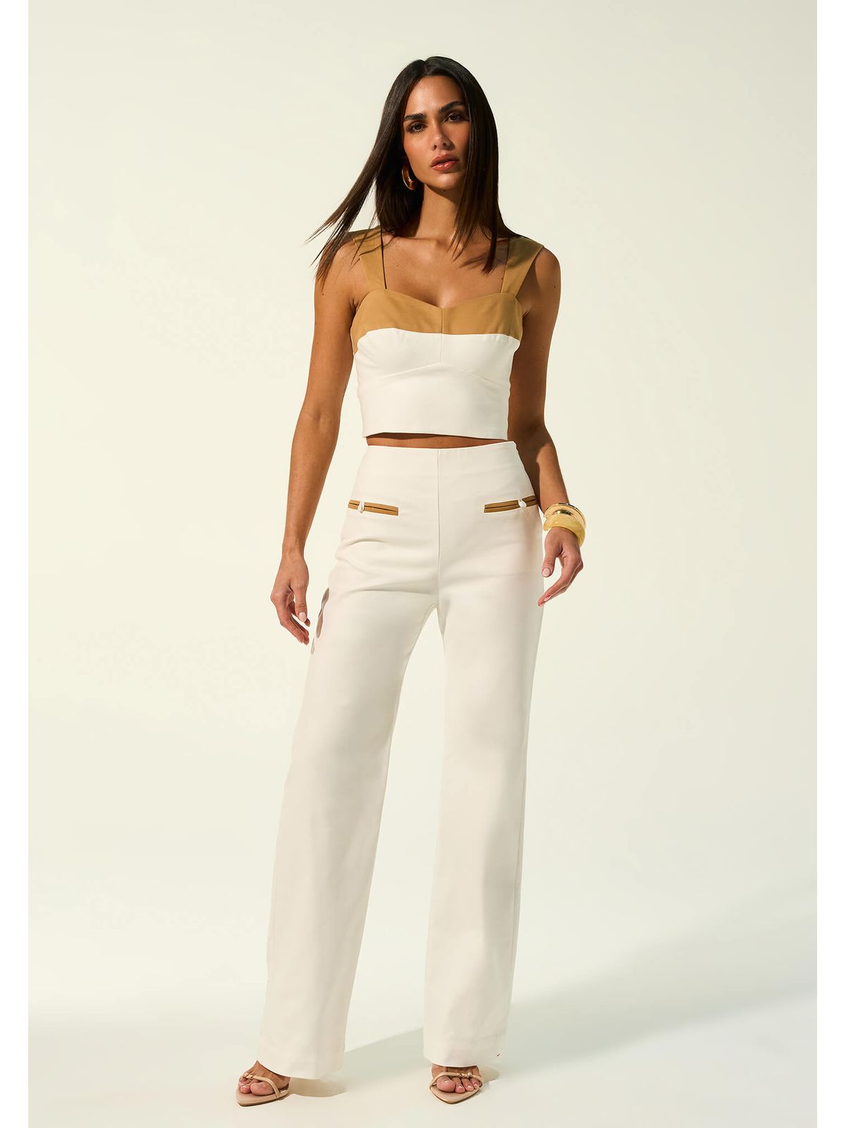 Calça confeccionada em sarja de alta qualidade, com toque macio e estrutura encorpada. Possui modelagem reta que valoriza a silhueta sem comprometer o conforto. Cintura média com cós reto e fechamento lateral por zíper. Detalhes de bolsos fakes na cor camel que adiciona o charme na peça.