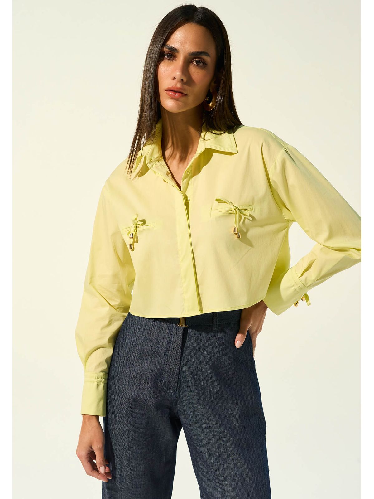 Camisa cropped com toque suave e caimento fluido. Possui modelagem encurtada, gola tradicional e fechamento frontal por botões. Destaque para os bolsos aplicados na parte frontal, que adicionam funcionalidade e estilo à peça. O detalhe em laço confere um toque feminino e delicado, ideal para composições modernas.