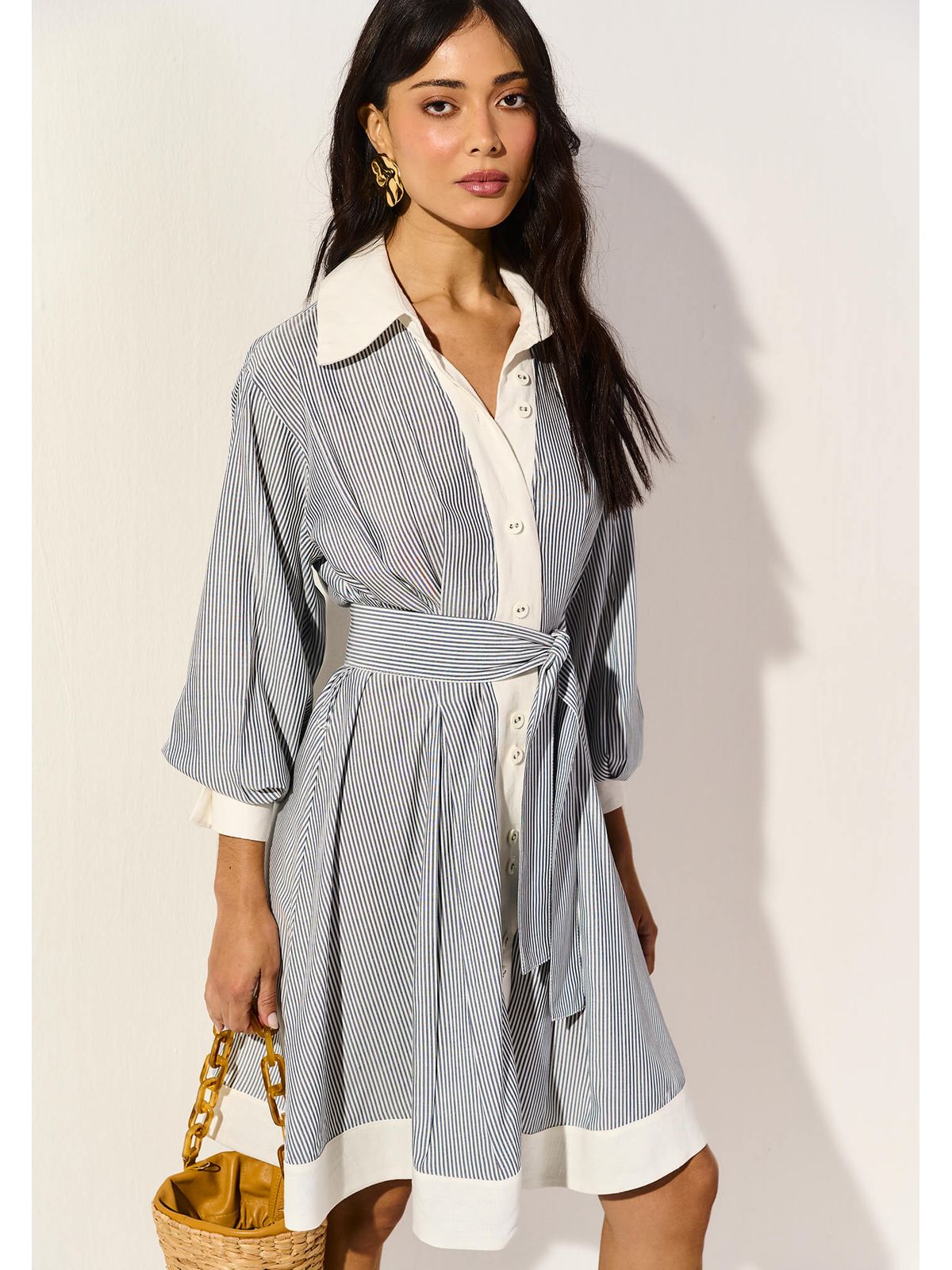 O chemise com mangas e detalhe com amarração é a escolha perfeita para unir estilo e conforto em um visual leve e moderno. Com estampa listrada atemporal, ele traz um ar casual chic. As mangas conferem um toque sofisticado, enquanto o detalhe de amarrar na cintura permite ajustar a peça ao corpo, realçando a silhueta com delicadeza.