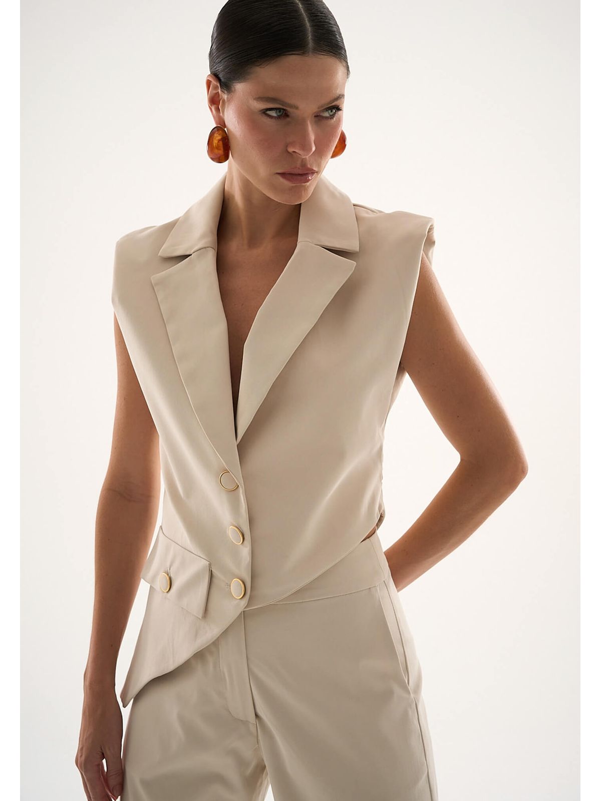 Colete com design contemporâneo e assimetria na barra, trazendo modernidade ao visual. Possui decote em V, botões forrados e leve ombreira, que confere estrutura e sofisticação à peça.