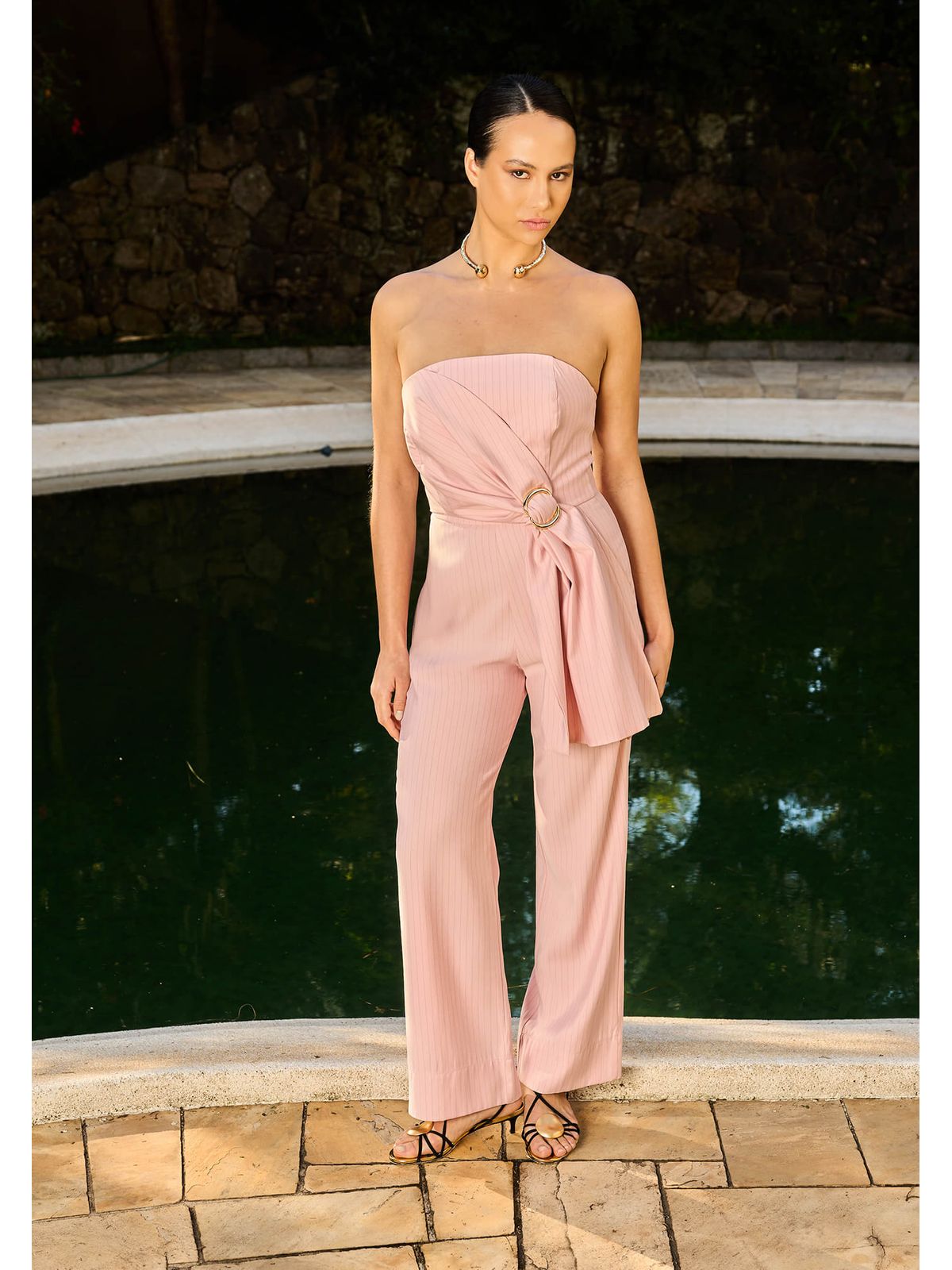 Macacão listrado com design moderno que destaca os ombros à mostra, trazendo um toque de charme e frescor ao visual.
