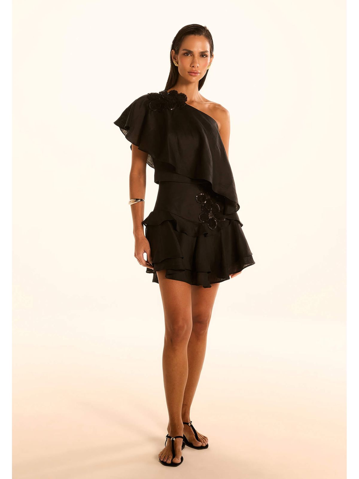Delicada e cheia de charme, esta saia curta de babados em linho é a escolha perfeita para looks leves e femininos. O caimento fluido dos babados traz movimento à peça, enquanto a aplicação de flor adiciona um toque artesanal e romântico. Feita em linho leve e fresco, é ideal para os dias quentes.