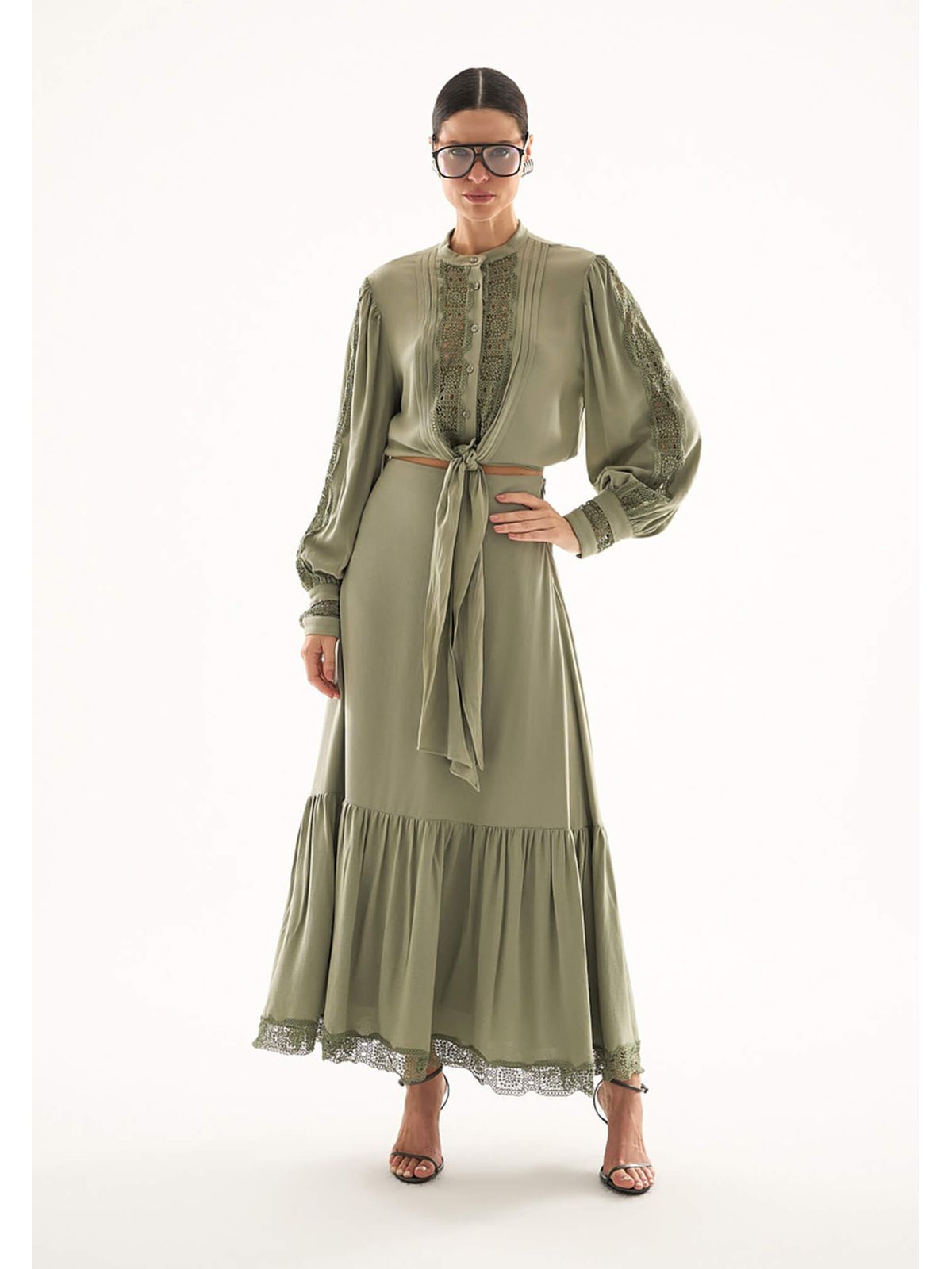 Saia fluida e elegante, com barrado que proporciona movimento natural a cada passo. O detalhe de entremeio no barrado adiciona um toque delicado e sofisticado, perfeita para combinações casuais ou looks mais elaborados.