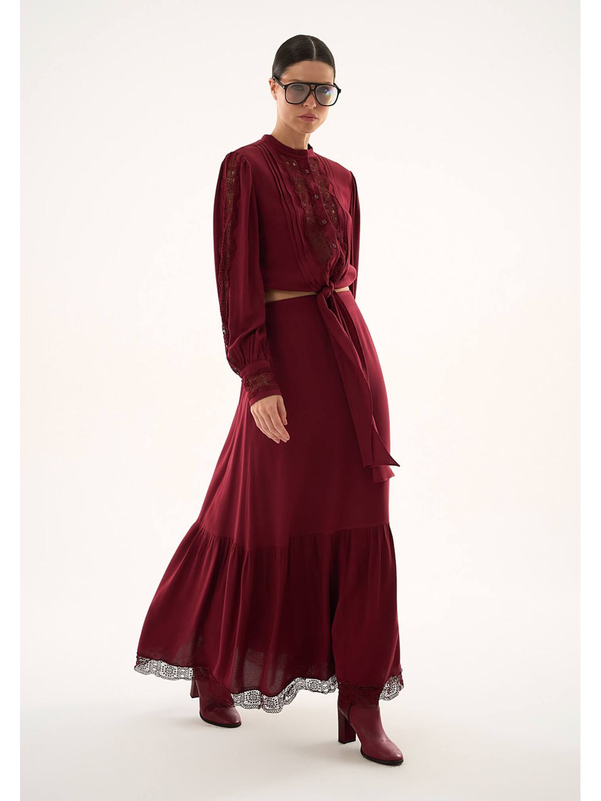Saia fluida e elegante, com barrado que proporciona movimento natural a cada passo. O detalhe de entremeio no barrado adiciona um toque delicado e sofisticado, perfeita para combinações casuais ou looks mais elaborados.