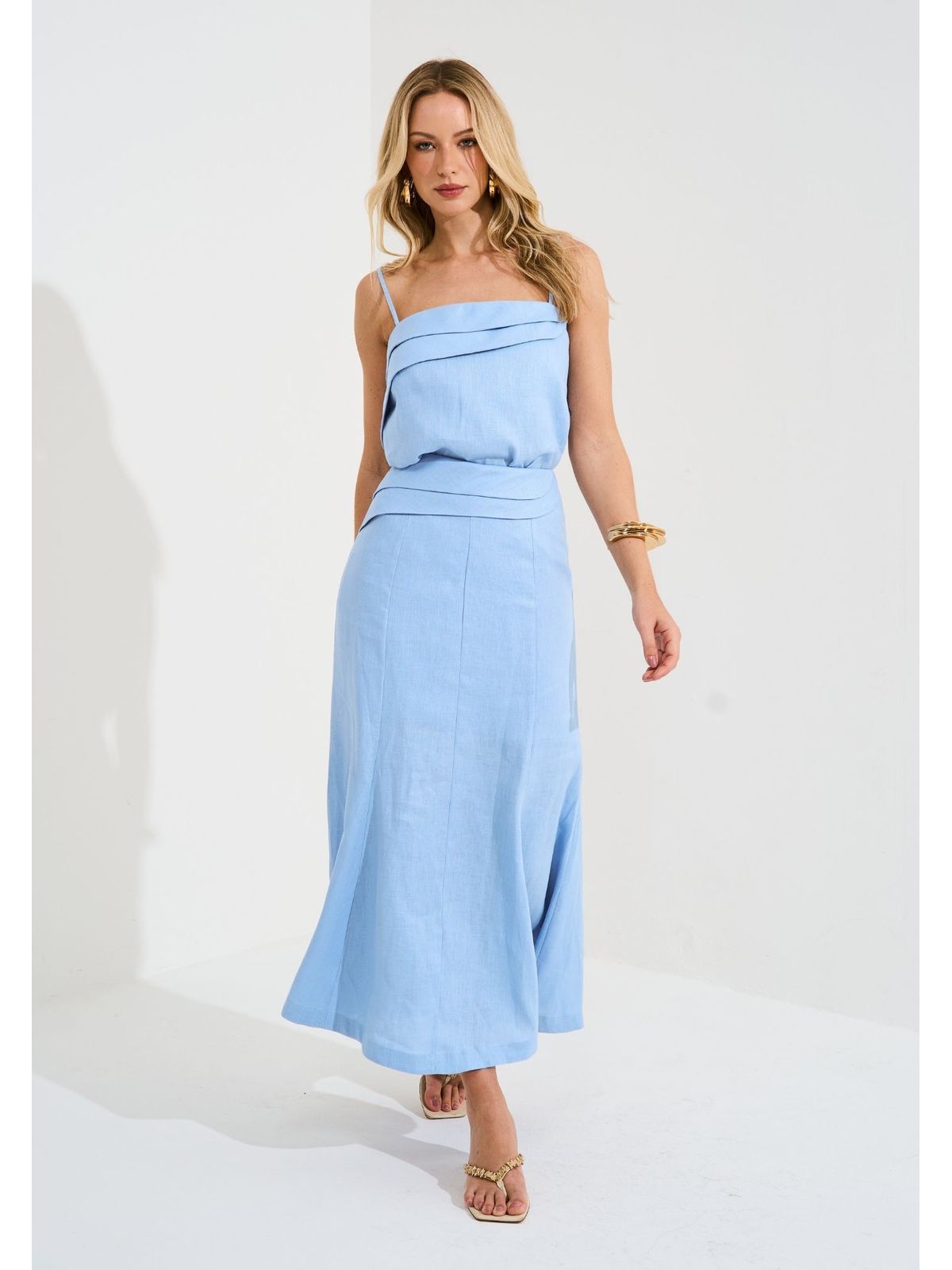 SAIA MIDI EM LINHO PREGAS AZUL