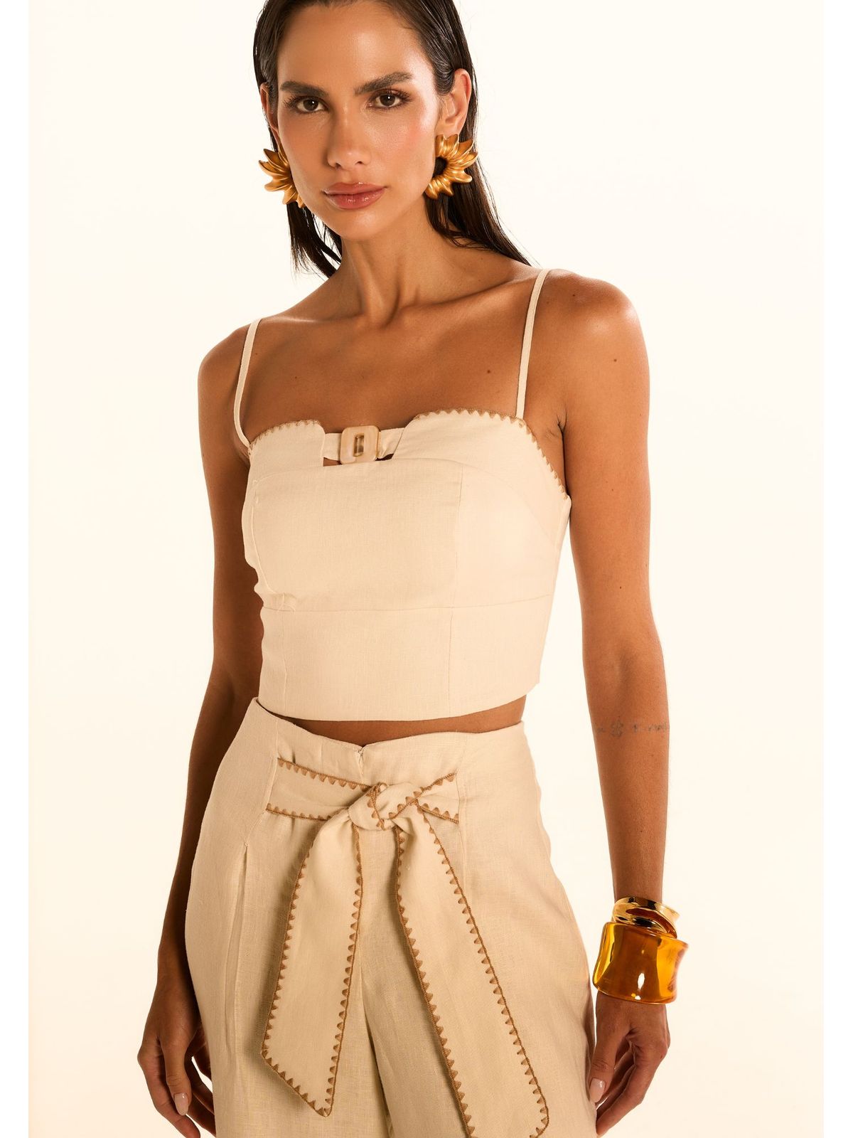 O Top Bordado EDI em linho combina o frescor do tecido natural com a delicadeza do bordado artesanal exclusivo da marca. O grande destaque fica por conta do detalhe dourado no busto, que traz um toque de sofisticação e brilho na medida certa. Com alças finas e reguláveis, oferece um ajuste confortável e elegante ao corpo.