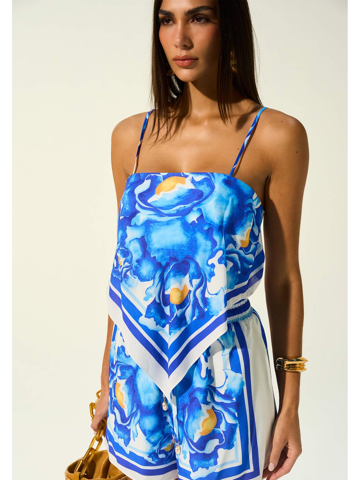 Top lenço com alças, podendo usar como tomara que caia . Levemente assimétrico na frente traz um toque romântico e moderno na medida certa. Com nossa estampa floral exclusiva em tons de azul e amarelo sobre fundo off-white, ele é a escolha perfeita para compor looks leves, frescos e cheios de personalidade .