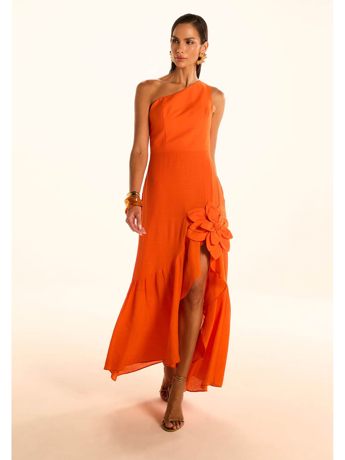 Elegância e estilo em um vestido moderno e feminino. O vestido um ombro confeccionado em linho traz a versatilidade que os modelos de verão pedem .O detalhe de flor na lateral dá um charme especial, enquanto a fenda valoriza a silhueta com delicadeza.