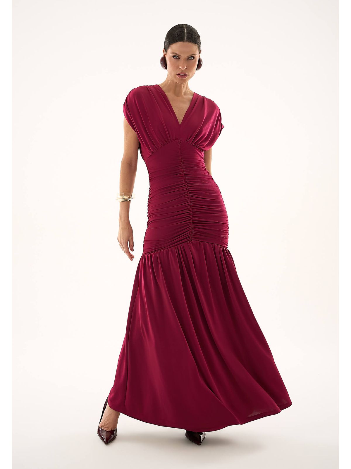 Vestido com drapeado em todo o corpo, proporcionando efeito sofisticado e valorizando as curvas. Possui decote em V que alonga a silhueta e barrado com movimento, garantindo leveza e elegância a cada passo.