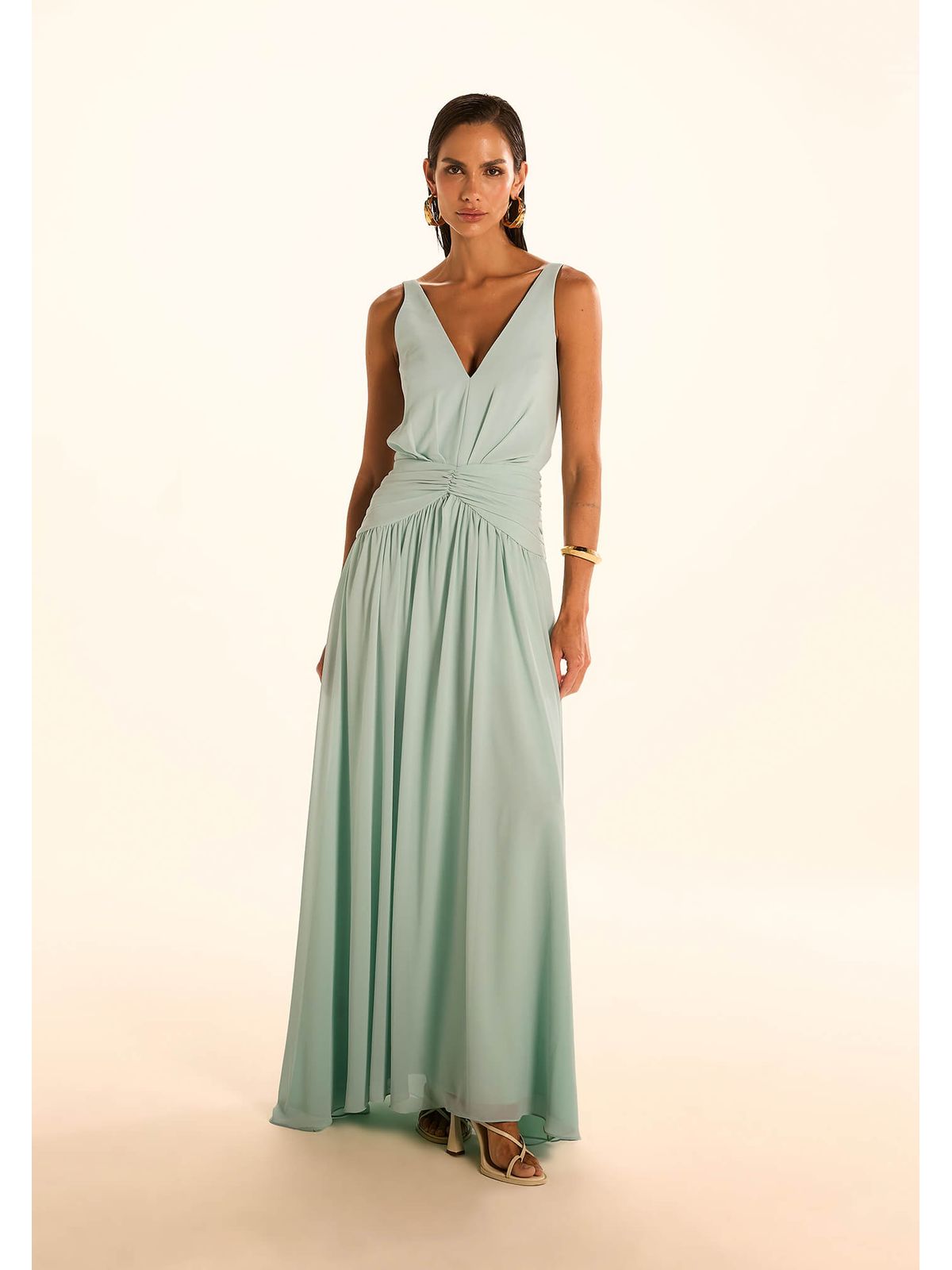 Delicado e envolvente, este vestido longo é a definição de leveza com sofisticação. Confeccionado em tecido fluido, ele apresenta um drapeado suave na parte frontal, que valoriza o caimento e traz movimento à peça.