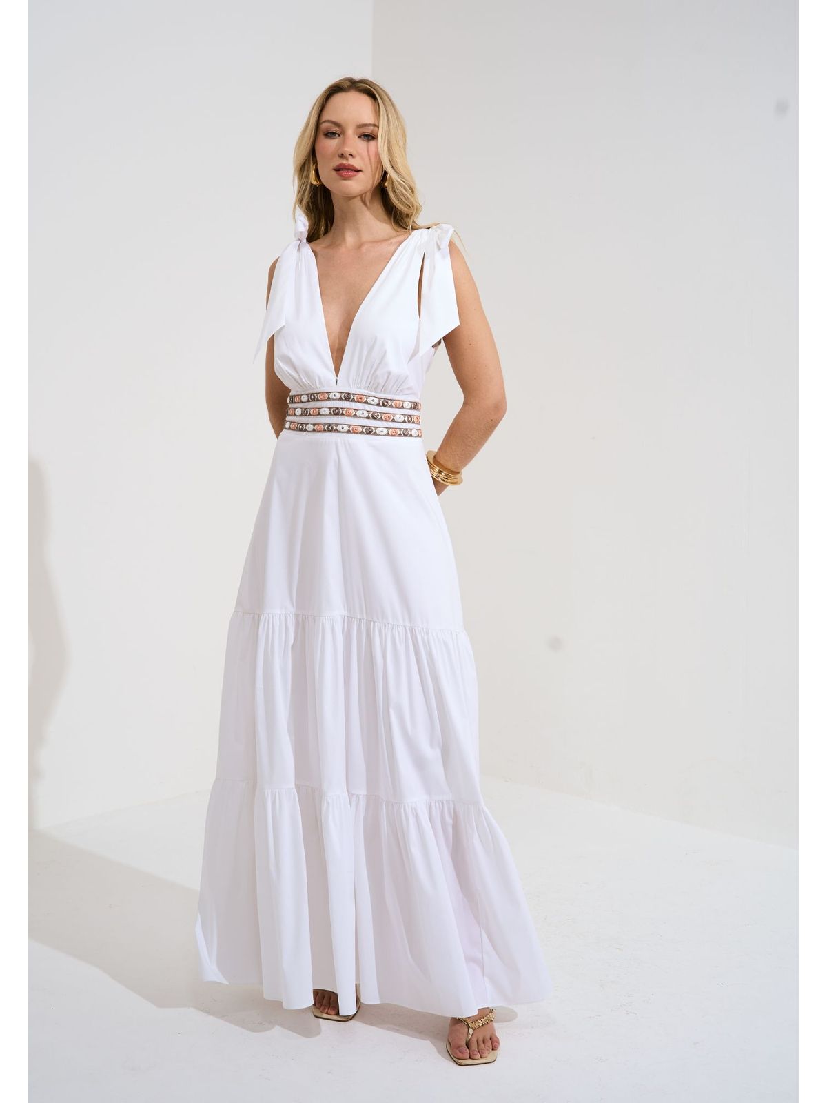 O Vestido Longo Pilar é a escolha perfeita para quem busca elegância e leveza em um só look. Confeccionado em tecido fluido, ele conta com delicados bordados artesanais que realçam sua sofisticação. As alças para amarrar permitem ajuste perfeito ao corpo, enquanto o aviamento dourado adiciona um toque de brilho e charme. Ideal para ocasiões especiais, festas ao ar livre ou eventos à beira-mar.
