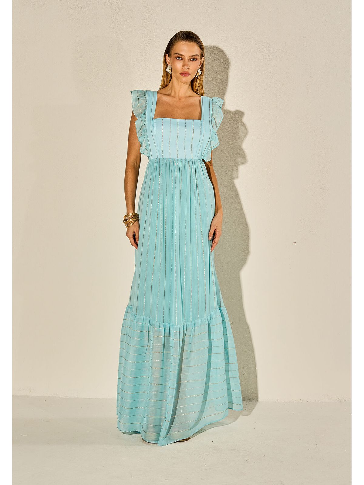 O vestido longo Sabrina é a expressão perfeita de elegância e romantismo. Com decote quadrado e alças largas com delicados babados, valoriza o colo e traz um toque feminino ao visual. Nas costas, o laço para amarrar adiciona charme e permite ajustar a peça de forma confortável. O forro até a metade do comprimento garante leveza e fluidez, ideal para dias mais quentes.